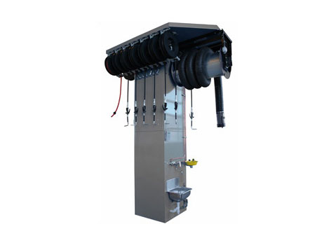 Сервисная стойка представляет из себя металическую конструкцию, которая преназначена для крепления на нее катушек для раздачи: сжатого воздуха, масла, смазки, антифриза, воды а также катушек для удаления выхлопных газов. На сервисную стойку может крепиться до 16 катушек.