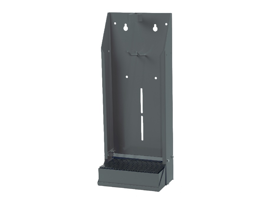 Кобура для маслораздаточных пистолетов, большая, на 1 пистолет, артикул 16782. Держатель пистолета маслораздаточного, съёмный поддон для сбора капель. Предназначен для хранения одного маслораздаточного пистолета в условиях СТО автомобилей и автобусов. Представляет собой Г-образную металлическую сборную конструкцию. Вертикальный и горизонтальный элемент выполнены из листового металла (сталь), они крепятся между собой болтовыми соединениями. На вертикальном элементе есть отверстия для крепления кобуры к стене, есть кронштейн для удержания маслораздаточного пистолета на весу. Нижний горизонтальный элемент, выполненный в виде поддона, укрыт перфорированным листом толщиной 1 мм. для фильтрования масла, частиц грязи и т.д., которые вытекают из маслораздаточного пистолета.