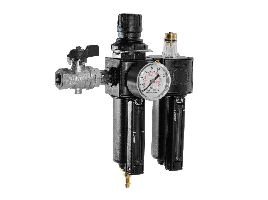 Блок подготовки воздуха, G1/4”, артикул 18726. Предназначен для смазки, регулирования и фильтрации воздуха. Клапан и манометр в комплекте.