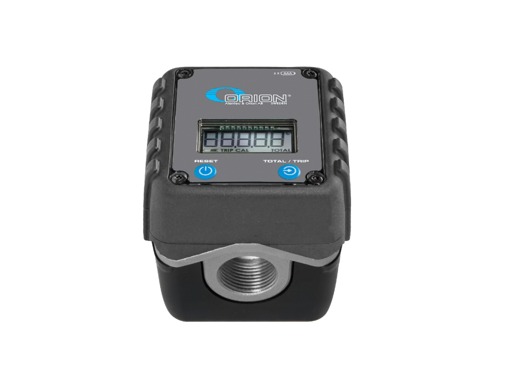 Расходомер арт. 25055 предназначен для определения объема протекающей через него жидкости (масло, гликоль, дизельное топливо). Используется как совместно с раздаточной катушкой, так и в составе централизованной системы раздачи жидкостей с электронным управлением и мониторингом Orilink. Корпус расходомера выполнен из алюминия, оснащен клеммами для подключения контроллера и светодиодом для индикации состояния раздаточной катушки, открыта она или нет. Оснащённый дисплеем текущего расхода и кнопкой сброса текущего расхода и кнопкой для индикации общего расхода. Цифровой дисплей питается от двух батареек типа ААА 1,5 В. Погрешность +/- 0,5 %. Может быть откалиброван.