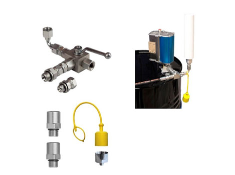 Комплект шарового крана и адаптеров, для использования одного насоса для раздачи смазки по двум каналам, первый канал предназначен для обычной смазки, через шланг и раздаточный пистолет, а второй канал предназначен для заполнения картриджей резьбового типа, которые используются в шприцах. Включает в себя адаптер для прикручивания картриджей винтового типа, колпачок для защиты от пыли и шаровый кран для переключения между каналами. Пустые картриджи в комплект не входят и продаются отдельно.