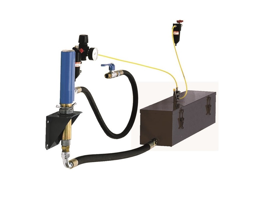 Комплект оборудования для автоматической откачки отработанного масла в сервисных ямах, артикул SPEC6011. Состоит из накопительной ёмкости объёмом 25 л. с поплавковым выключателем и перекачивающим насосом (1:1) с пневмоприводом с